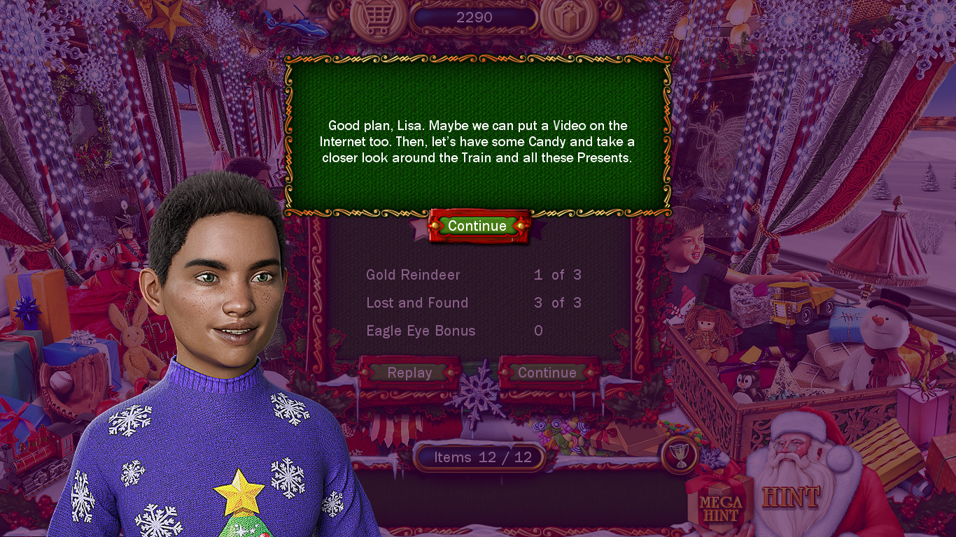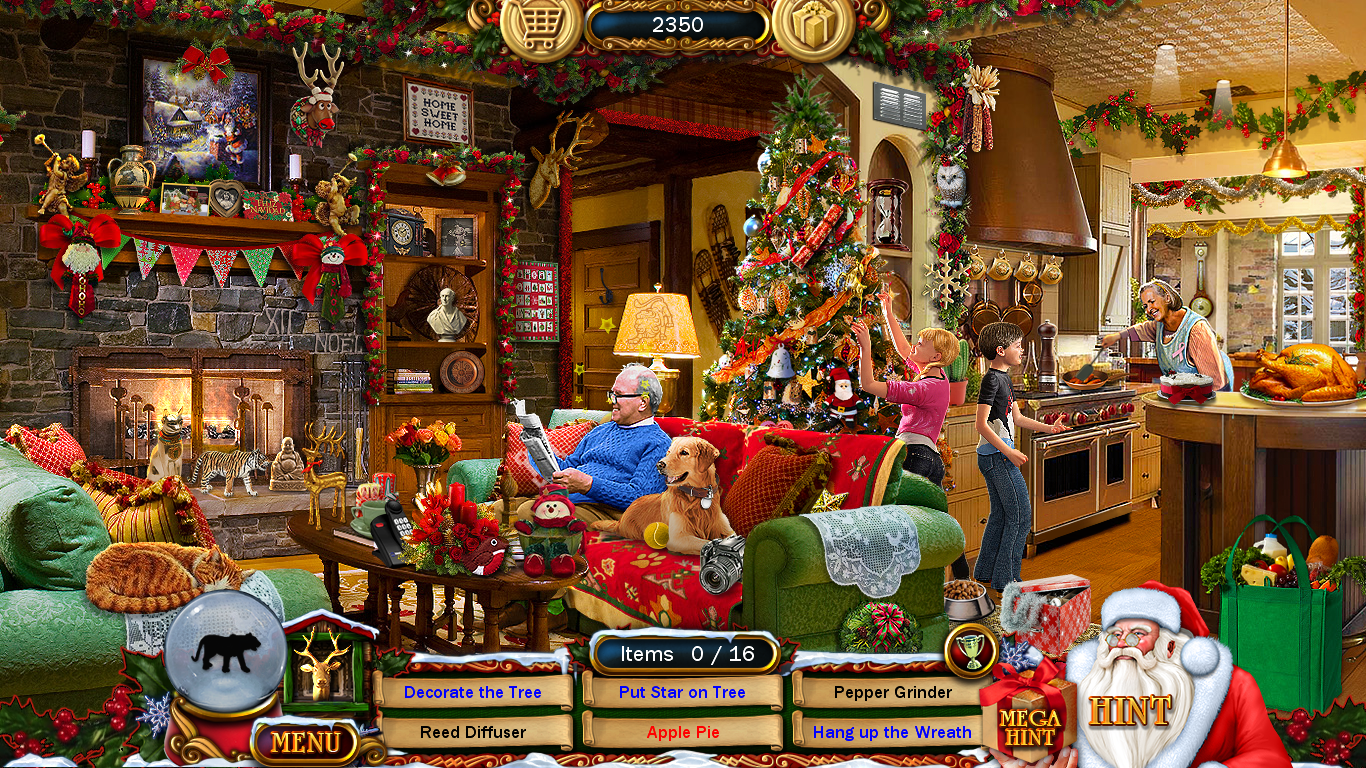 HToT2 are replaced by golden reindeer, and there are also a few silhouetted items hidden in each scene that you can look for if you just aren’t getting enough hidden object action from the main list.
