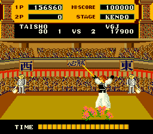 From one form of swordplay to another as the middle portion of Great Swordsman becomes a kendo tournament. Unsurprisingly, the ancient Japanese art of whacking people with stick while wearing a wicker basket on your head plays almost identically to the fencing section, with high, middle and low attacks. The difference is that you only have to hit your opponent twice in order to beat them, presumably to authentically recreate the strength of a katana's superior Japanese steel when compared to the flimsy weapons of Europe.