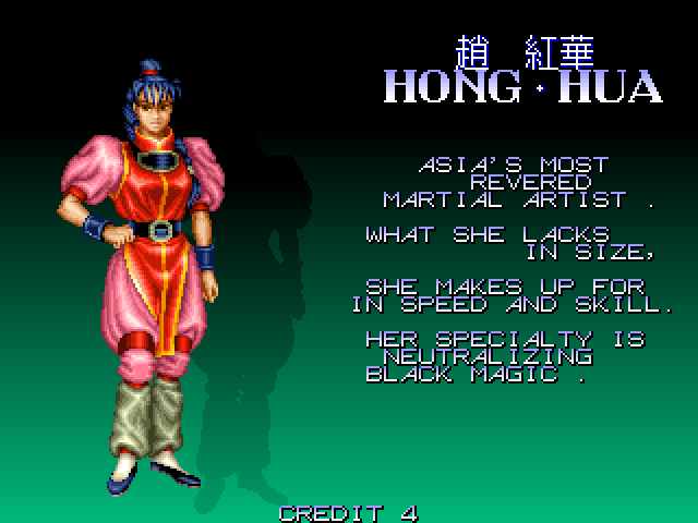 Finally there's Hong Hua, the speedy-yet-weak martial artist of the group. Night Slashers must take place in some distant future where Jackie Chan has sadly passed away, because she's described as "Asia's most revered martial artist".