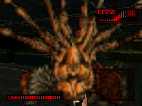 OH GOD GET IT OFF! See, I was struggling so badly with the controls that a facehugger managed to latch on to me and it's not nearly as charming as the phrase "face hugger" would suggest. Luckily I'm not with (alien) child now; all that happens is you take a little damage because I guess all the facehuggers in this game are sterile? Yeah, the facehugger as a videogame enemy is a hard one to get right. On the one hand, having a tiny, fast, hard-to-shoot monster than can instantly kill you would be incredibly frustrating, especially given that in Alien Trilogy they're more numerous than reprehensible comments on YouTube. Making them an unthreatening nuisance enemy rather takes away from the horror of them, but that's what they are here and you will be seeing a lot of them. What else is there for me to shoot?