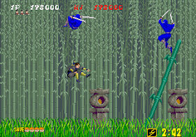 I'm a little confused about how being in this position results in my immediate death. You'll notice that ninja's not actually touching me, and I have a hand full of shurikens, sooo... you know what, never mind, it's probably just ninja etiquette to fall over dead when a fellow ninja waves his hands at you. No extra life for me as I enter stage two, then.