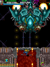 Look at all the detail packed into those walls, by the way. You could have just drawn a wall, a plain and simple wall, but no - they're encrusted with camera lenses and strange vents and blinking lights. The graphics are definitely a good reason to play Out Zone, especially if you're into that heavily-detailed 90s cyberpunk anime look, something that's also true of the many "standard" shoot-em-ups that Toaplan are famous for such as Batsugun and Grind Stormer.