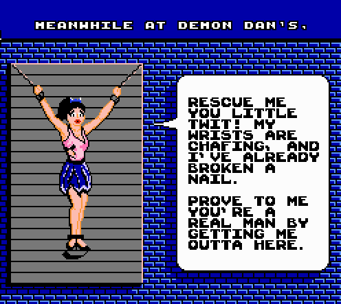 When it comes to plot, Menace Beach goes for the tried-and-tested “kidnapped girlfriend” angle. Ignore for the moment that the likelihood of that thing from the title screen going out on the town with a girl and not being banished to a circus sideshow is vanishingly small. This is Bunny, and she’s been abducted and chained up by someone, somewhere. She’s sending out mixed messages about the severity of her situation - casual disappointment that her date at the “malt shop” has been cancelled, a pun about being “tied up” and finally the subtle threat of violence if I don’t get my skates on and rescue her. And when I say “get my skates on,” I mean…